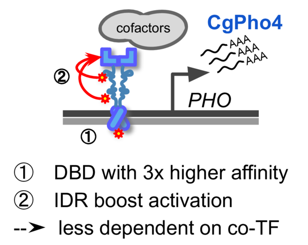 Combinatorial control by transcription factors (TFs) is central to eukaryotic gene regulation, yet its mechanism, evolution, and regulatory impact are not well understood. Here we use natural variation in the yeast phosphate starvation (PHO) response to examine the genetic basis and species variation in TF interdependence. In Saccharomyces cerevisiae, the main TF Pho4 relies on the co-TF Pho2 to regulate ~28 genes, whereas in the related pathogen Candida glabrata, Pho4 has reduced Pho2 dependence and regulates ~70 genes. We found C. glabrata Pho4 (CgPho4) binds the same motif with 3–4 fold higher affinity. Machine learning and yeast one-hybrid assay identify two intrinsically disordered regions (IDRs) in CgPho4 that boost its activation domain’s activity. In ScPho4, an IDR next to the DNA binding domain both allows for enhanced activity with Pho2 and inhibits activity without Pho2. This study reveals how IDR divergence drives TF interdependence evolution by influencing activation potential and autoinhibition.